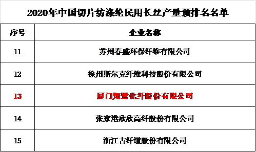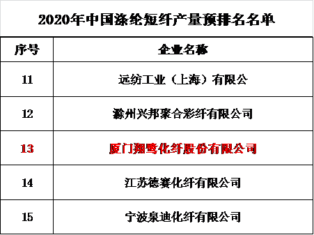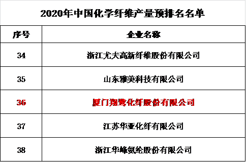 “2020年中國(guó)化纖行業(yè)產(chǎn)量預(yù)排名”在會(huì)上發(fā)布,翔鷺化纖2020年纖維總產(chǎn)量位列中國(guó)第36,切片紡滌綸民用長(zhǎng)絲產(chǎn)量和滌綸短纖產(chǎn)量均位列中國(guó)第13。